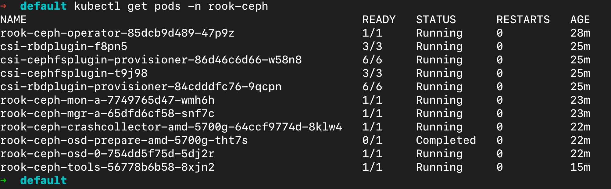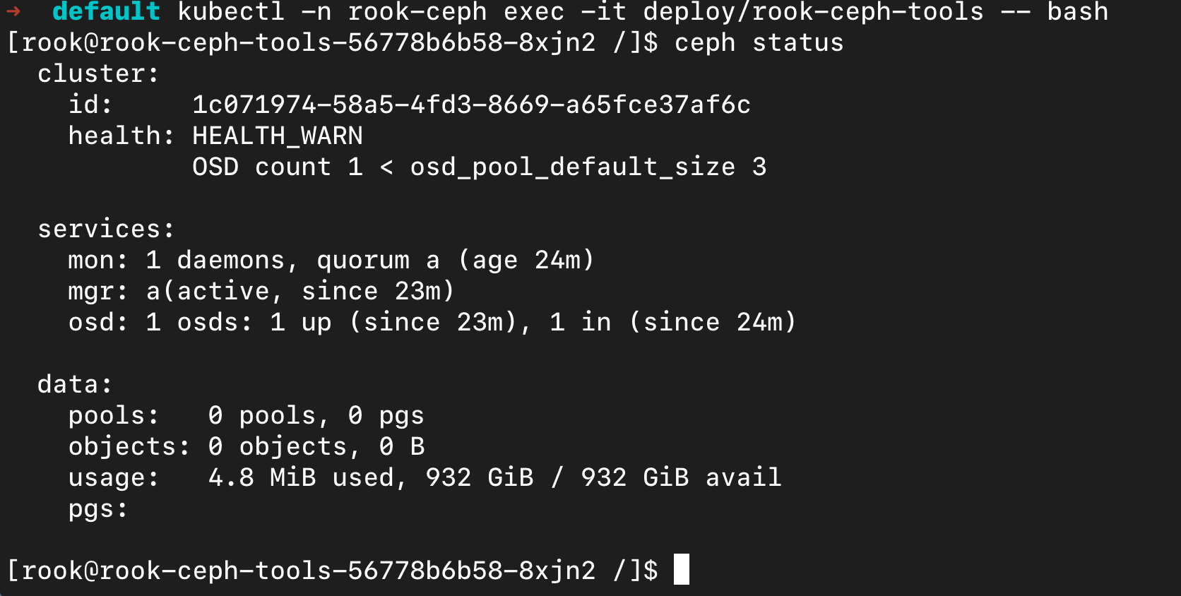 # For example, to create the cluster: # kubectl create -f crds.yaml -f common.yaml -f operator.yaml # kubectl create -f cluster-test.yaml ################################################################################################################# kind: ConfigMap apiVersion: v1 metadata: name: rook-config-override namespace: rook-ceph # namespace:cluster data: config: | [global] osd_pool_default_size = 1 mon_warn_on_pool_no_redundancy = false bdev_flock_retry = 20 bluefs_buffered_io = false --- apiVersion: ceph.rook.io/v1 kind: CephCluster metadata: name: my-cluster namespace: rook-ceph # namespace:cluster spec: dataDirHostPath: /var/lib/rook cephVersion: image: quay.io/ceph/ceph:v17 allowUnsupported: true mon: count: 1 allowMultiplePerNode: true mgr: count: 1 allowMultiplePerNode: true dashboard: enabled: true crashCollector: disable: true storage: useAllNodes: false useAllDevices: false #deviceFilter: config: # crushRoot: "custom-root" # specify a non-default root label for the CRUSH map # metadataDevice: "md0" # specify a non-rotational storage so ceph-volume will use it as block db device of bluestore. # databaseSizeMB: "1024" # uncomment if the disks are smaller than 100 GB # journalSizeMB: "1024" # uncomment if the disks are 20 GB or smaller osdsPerDevice: "1"# this value can be overridden at the node or device level # encryptedDevice: "true" # the default value for this option is "false" # Individual nodes and their config can be specified as well, but 'useAllNodes' above must be set to false. Then, only the named # nodes below will be used as storage resources. Each node's 'name' field should match their 'kubernetes.io/hostname' label. nodes: - name: "amd-5700g" devices: # specific devices to use for storage can be specified for each node - name: "sda" deviceFilter: healthCheck: daemonHealth: mon: interval: 45s timeout: 600s priorityClassNames: all: system-node-critical mgr: system-cluster-critical disruptionManagement: managePodBudgets: true --- apiVersion: ceph.rook.io/v1 kind: CephBlockPool metadata: name: builtin-mgr namespace: rook-ceph # namespace:cluster spec: name: .mgr replicated: size: 1 requireSafeReplicaSize: false
