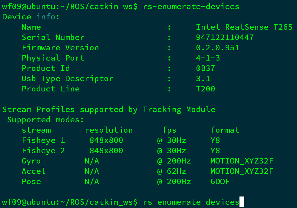 T265在出厂前就对相机进行了标定,每个相机内部都带有相机的内参和外参,终端输入以下命令,即可读取T265的配置信息