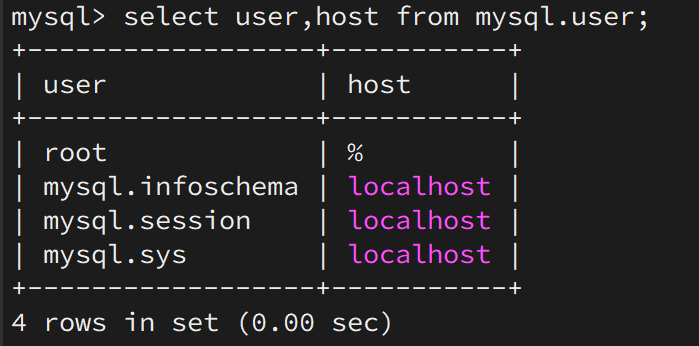 查询默认的mysql.user表,如下表示不允许外网访问,只允许本机访问: